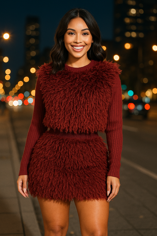 Faux Leather Top and Skirt Set With Faux Fur Trim