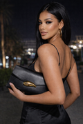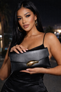 Elegant black clutch featuring a gold clasp, perfect for evening events, parties and special