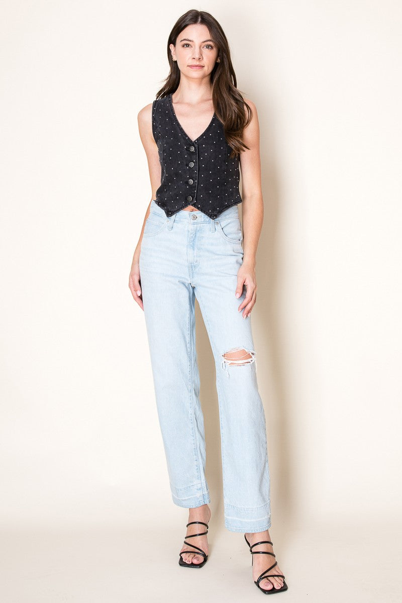 Faded Washed Denim Vest with Rhinestone