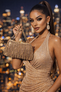 Elegant champagne clutch featuring sparkling rhinestone details and a structured gold-tone frame. Perfect for evening events, weddings, and special occasions.