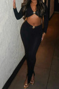 Elegant black two-piece set featuring a long sleeve ruched crop top with gold buckle detail and matching high-waist pants. Stretchy, flattering and perfect for night out or special occasions.