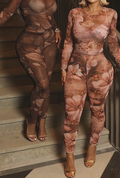 Stylish two- piece outfit featuring a long sleeve top and matching mesh leggings. Designed for a sleek, flattering fir perfect for casual or dressy looks.