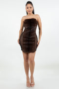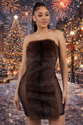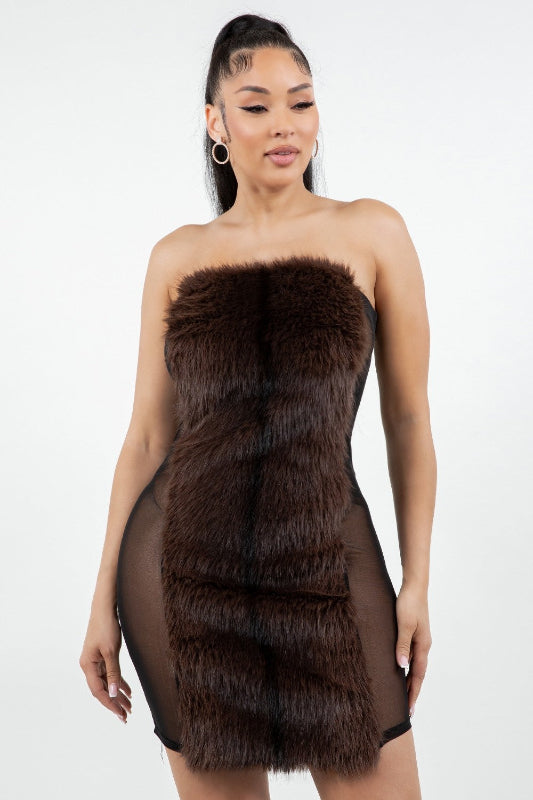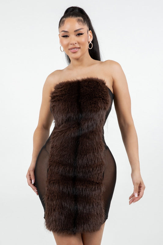 Striking strapless bodycon dress featuring luxurious faux fur detailing and sheer mesh panels for a bold, glamorous look. Perfect for holiday events, night out or special occasions