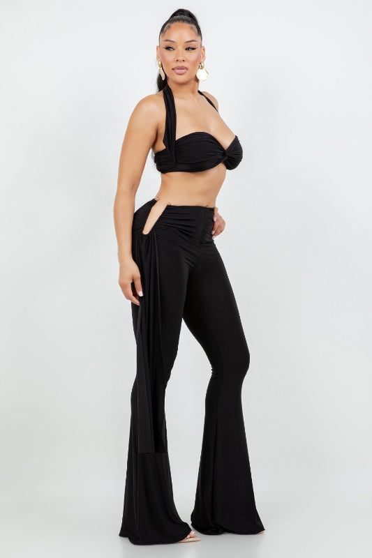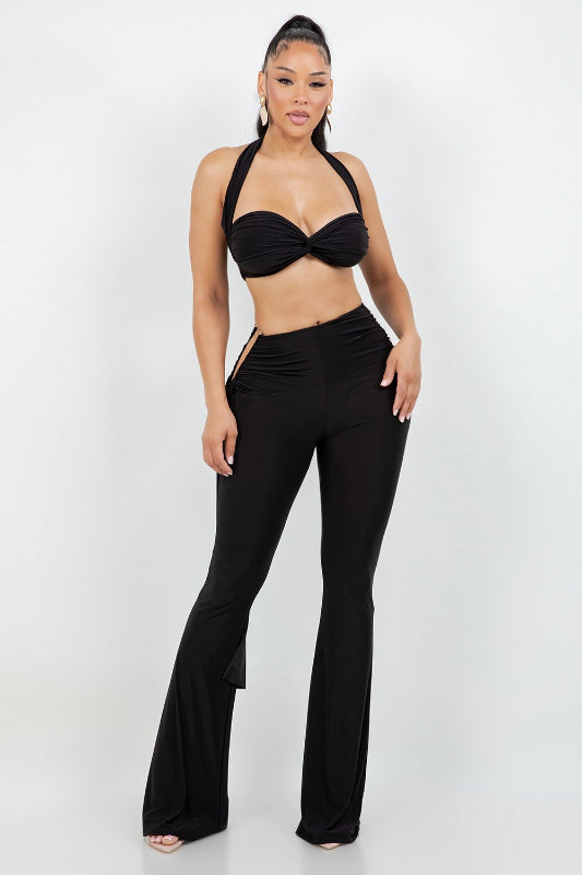Elegant black two-piece set featuring a halter twist crop top and high-waist wide-leg pants. Soft stretch fabric that hugs the body while keeping a classy, flowy silhouette perfect for night our or special occasions.