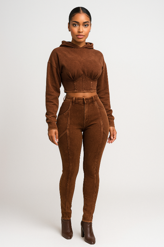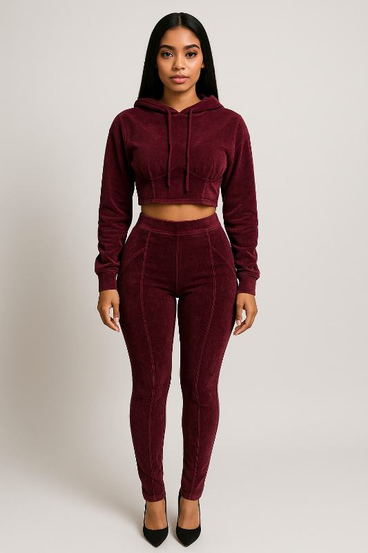 Elevate your athleisure look with our elegant Mineral Washed Hood Top and Leggings. The unique mineral wash gives a luxurious touch while the hood provides an exclusive, high-end vibe.