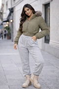 Cropped puffer jacket featuring a zip-up front, cozy insulated design, and a fur trimmed hood. Perfect for casual streetwear looks while keeping you warm and stylish