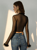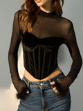 Sheer Mesh Panel Velvet Crop Shirt with Fur Trim